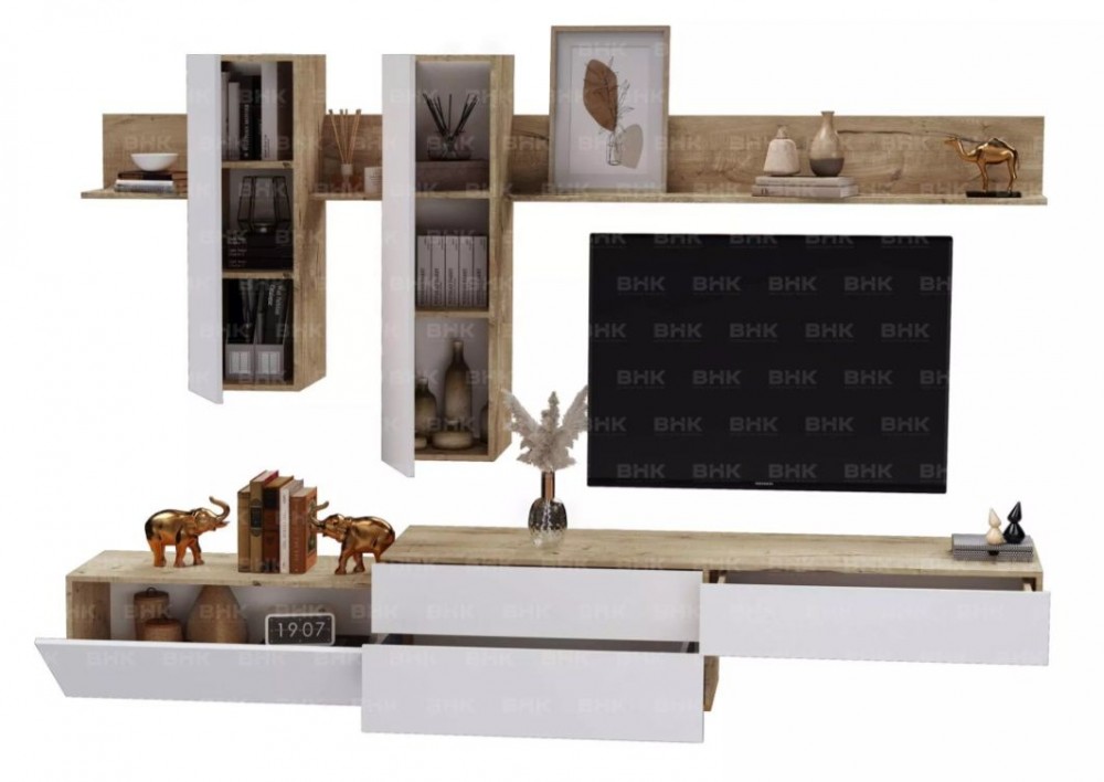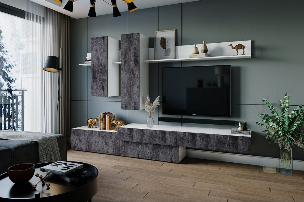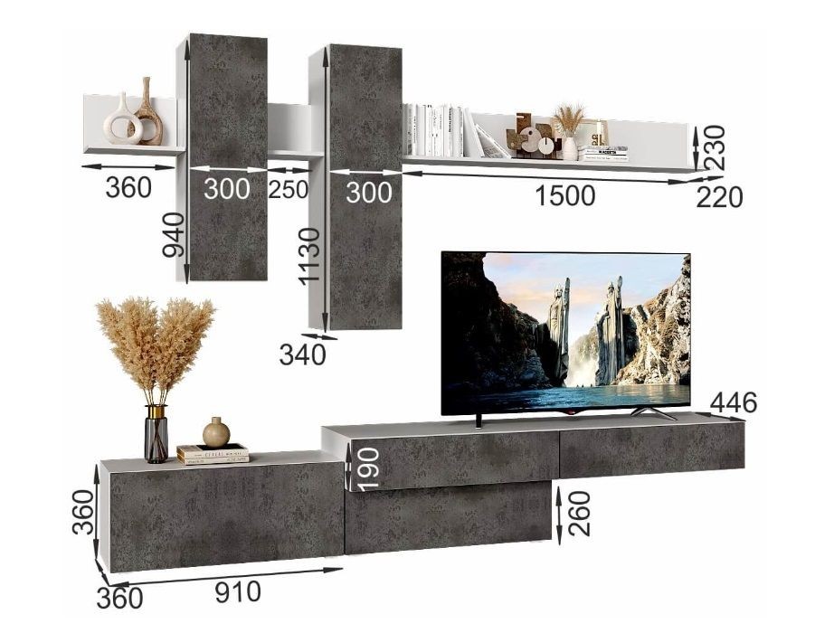 Стильная гостиная «Фрида» по праву займет центральное место Вашей зоны отдыха, вмещая в себя все самое необходимое для хранения декора, вещей, просмотра ТВ и другого досуга.