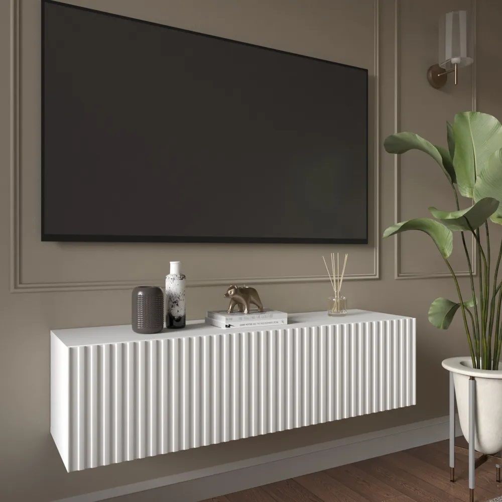 Благодаря своей компактности тумба под ТВ подвесная поможет сэкономить пространство, избежать ощущения загромождённости гостиной, спальни или детской комнаты, а рифлёный фасад будет акцентировать